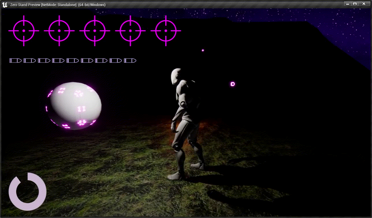 Zero Stand is a third person shooter created in Unreal Engine 4 with the objective of hitting all targets in each level within the designated time limit and a restricted number of projectiles. The targets utilize a dynamic material to demonstrate "Hit" status.